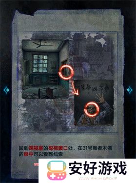 23、接着回到探视室,通过观察31号病患木偶的眼球,玩家可以得到保险箱的线索。